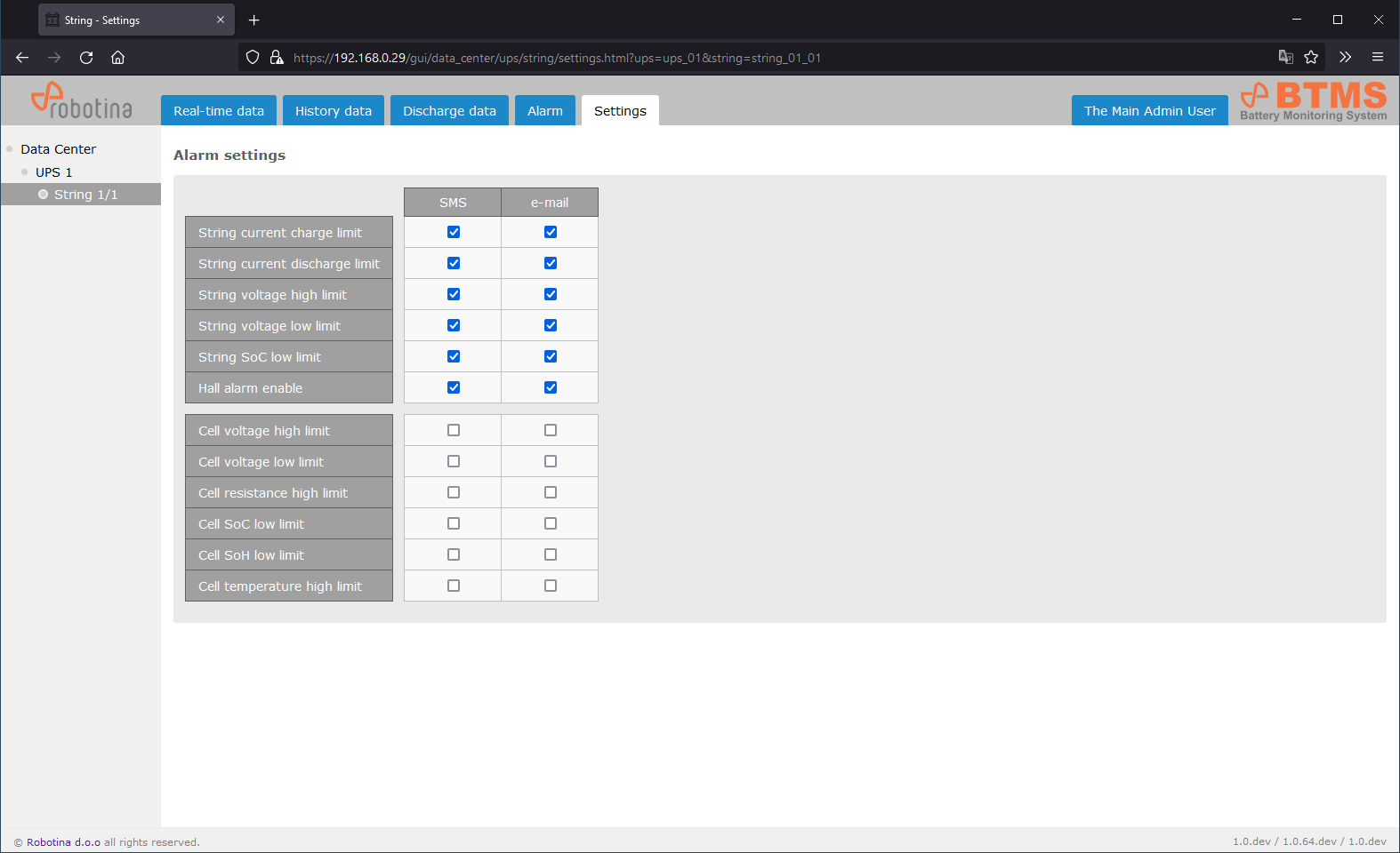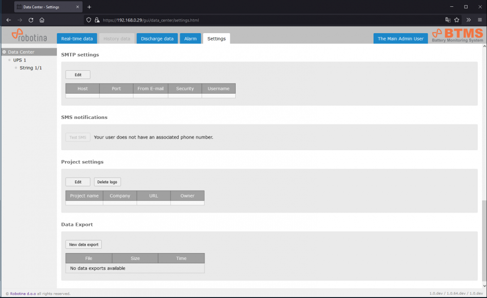 SNMP settings, SMS notifications, Project settings, Data export