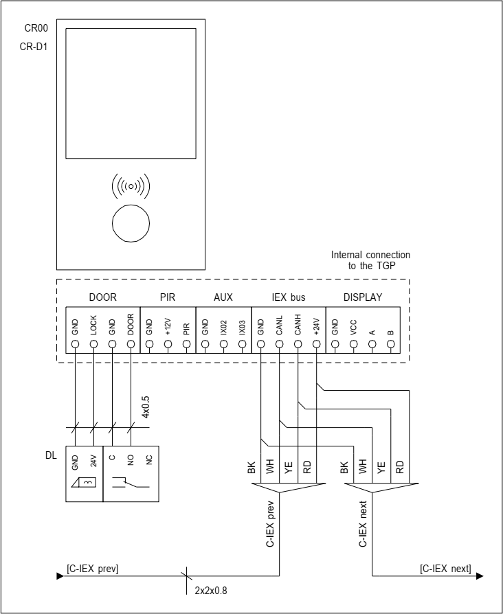 - DL (door lock) – example wiring of an electric lock (24V, NO/NC contacts)