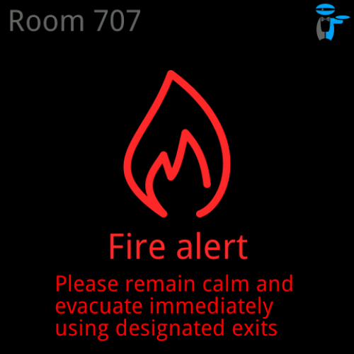 The fire alert screen is activated when abnormal temperature or fire conditions are detected.