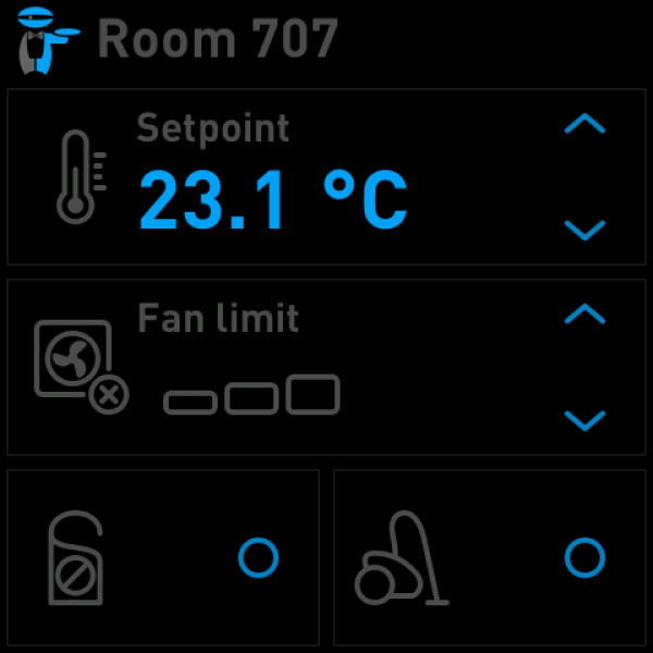 The room panel is the main interface for guest interaction inside the room, enabling control of comfort functions and room status.