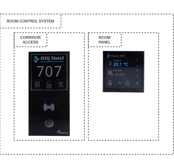 The corridor panel provides room identification, access functionality, and communication with guests, while the room panel enables control of comfort settings such as HVAC, lighting, and service functions.