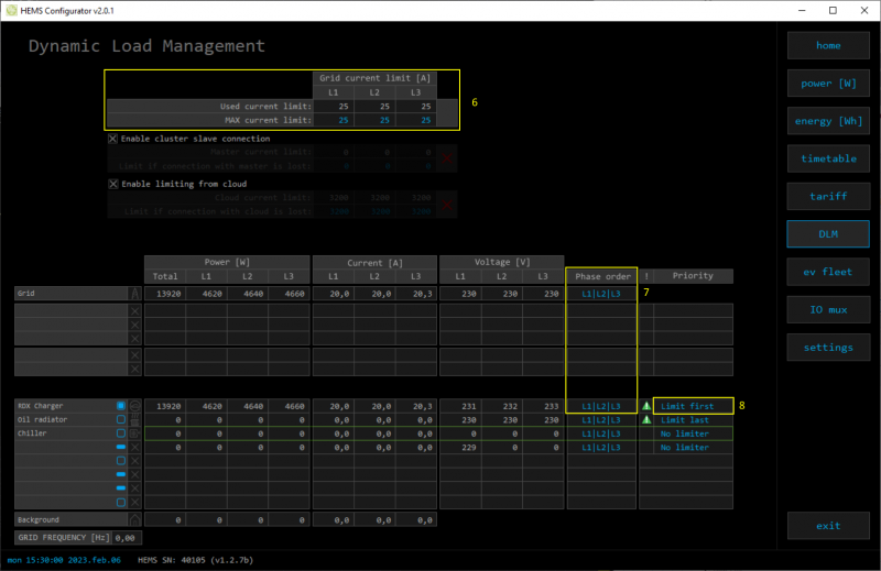 - HEMS Configurator → DLM, enter allowed current value of grid fuses (6)