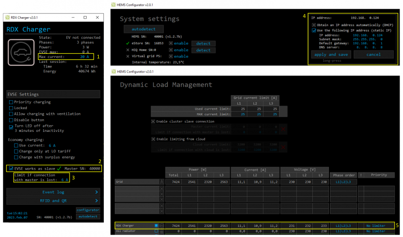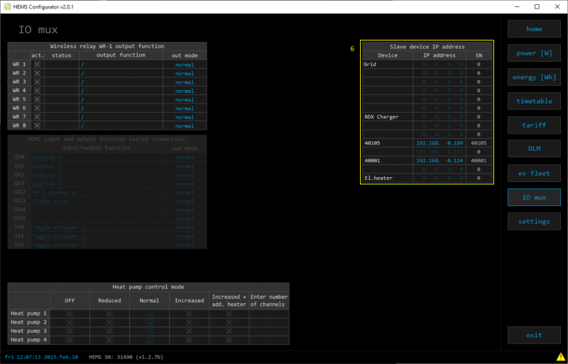 • HEMS Configurator → IO mux → enter IP address of slave RDC Charger (6). Serial number (SN) will be listed automatically once connection is established.