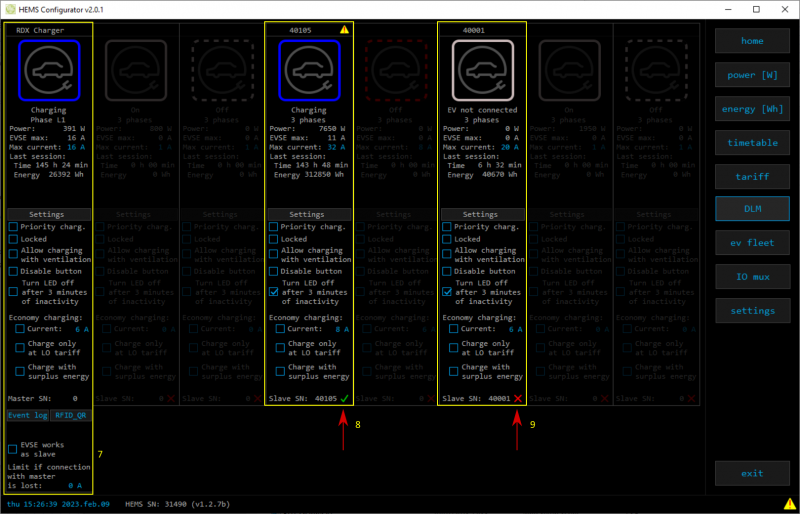 (9) connected slave RDC Charger with disabled control (red X) → master can not control it! To enable control, run RDC Charger app on slave charger and enable “EVSE works as slave”.